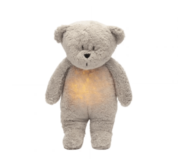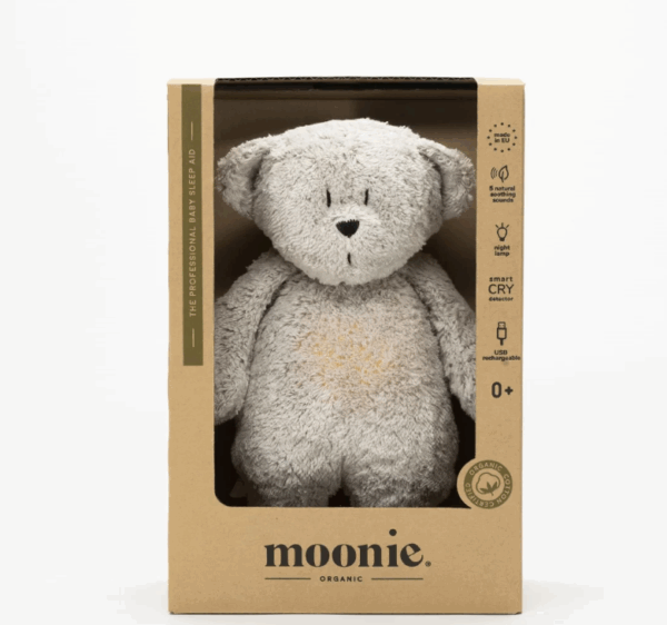 MOONIE Bear is a soft plush toy made from organic cotton, created to help babies relax and fall asleep more easily. Its natural “pink noise” sounds have a calming effect, helping little ones unwind and drift off to sleep quickly.