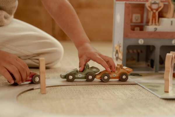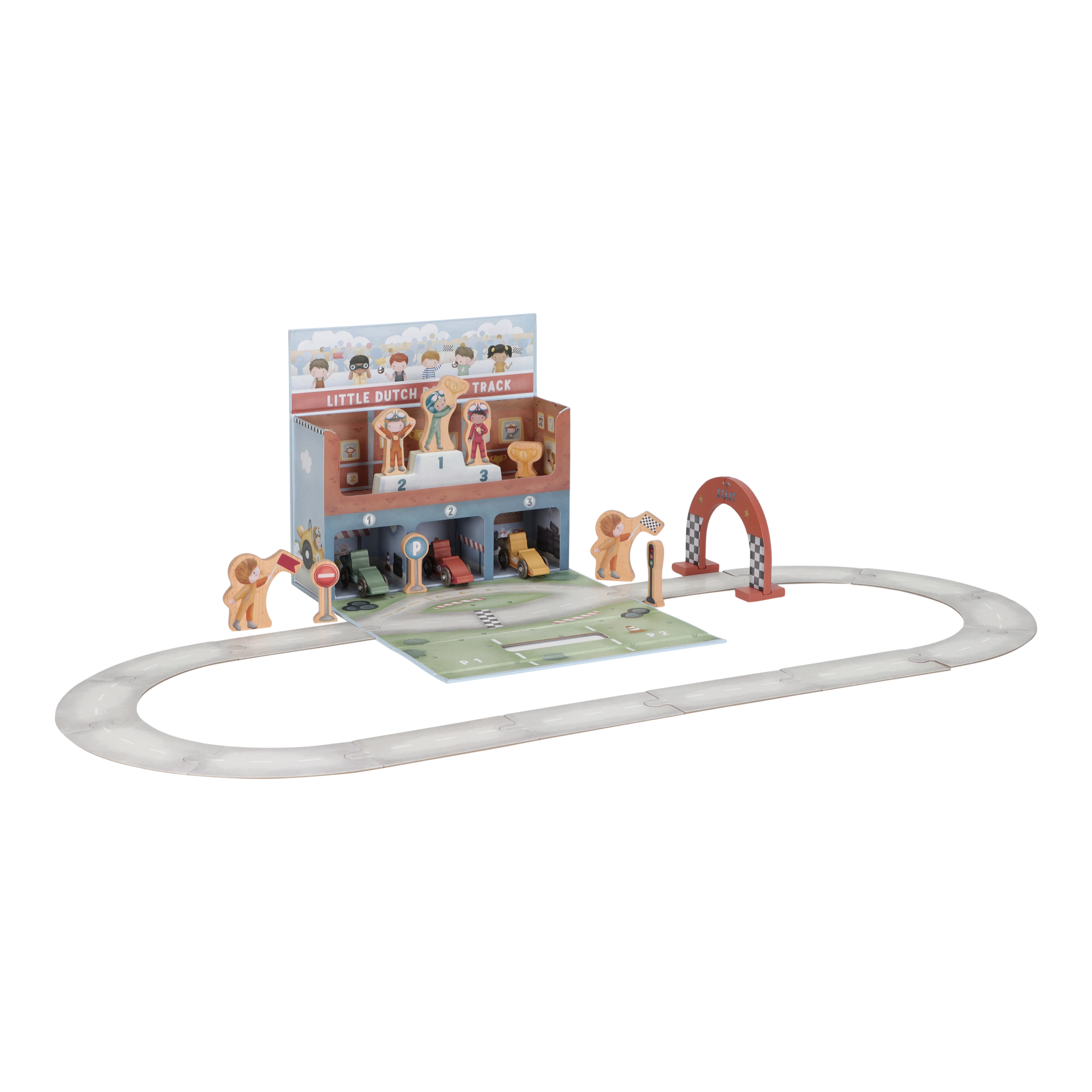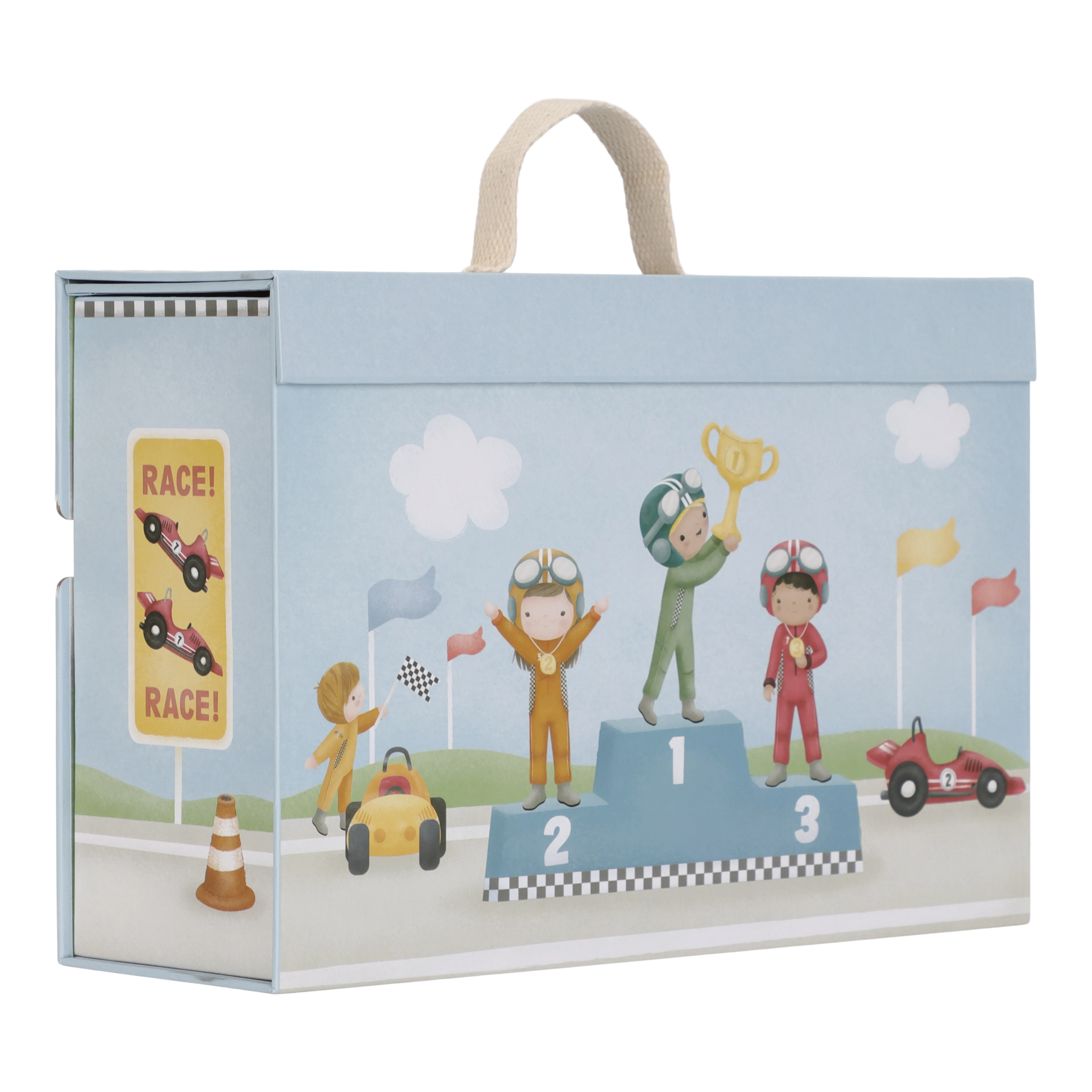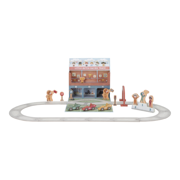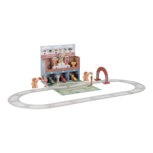 Open the box and build your own racetrack. Inside, you’ll find cars, drivers, a finish line, traffic signs, a trophy, and a podium – everything you need for exciting races.