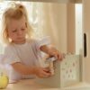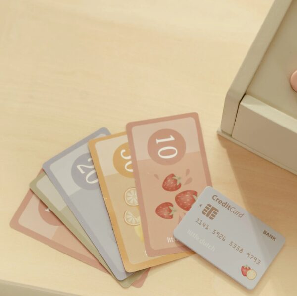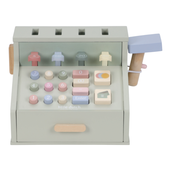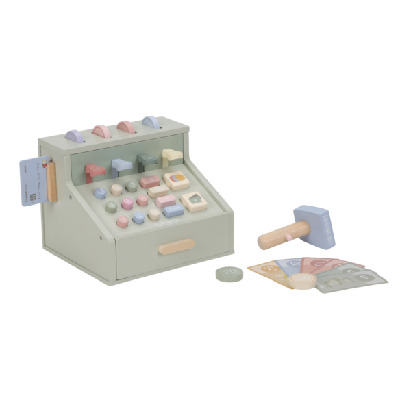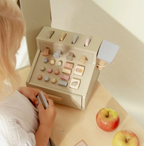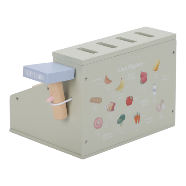 Računanje, skeniranje i naplata! Uz ovu drvenu kasu, igra prodavnice deluje još realnije. Kasa je opremljena skenerom, čitačem kartica, dugmićima i fiokom za novčiće i novčanice. U setu je i kartica, pa kupci mogu da plate i gotovinom i karticom. Sjajan način da se deca kroz igru upoznaju sa novcem i brojevima. Šta će biti danas?