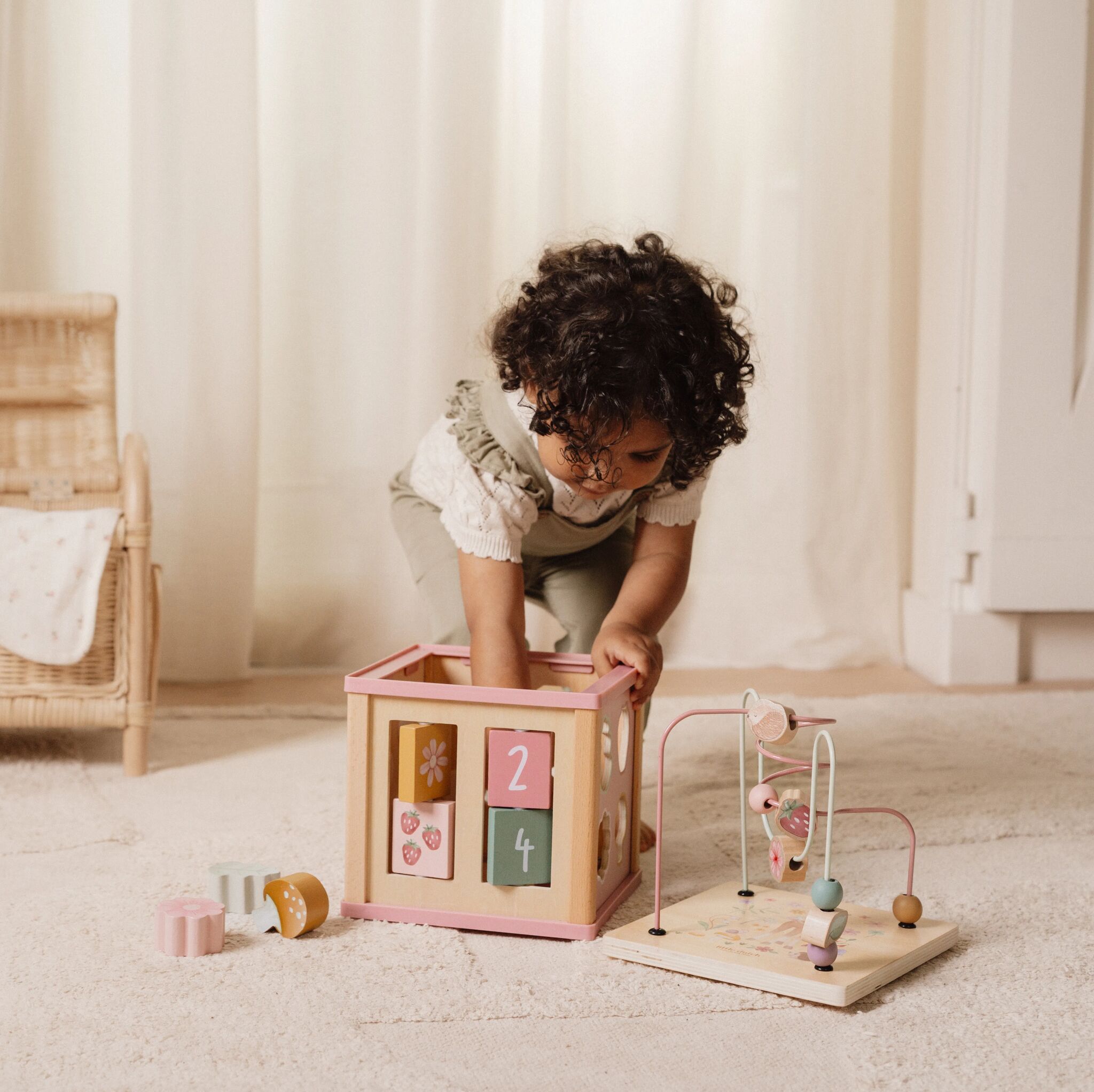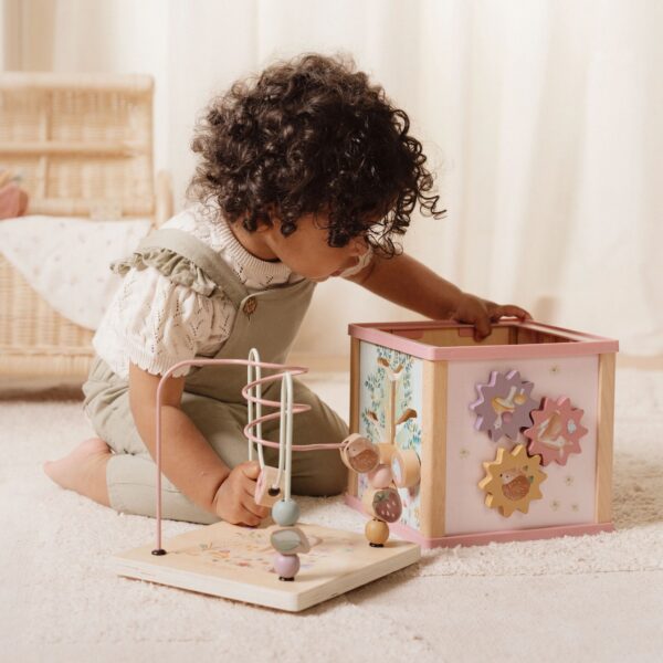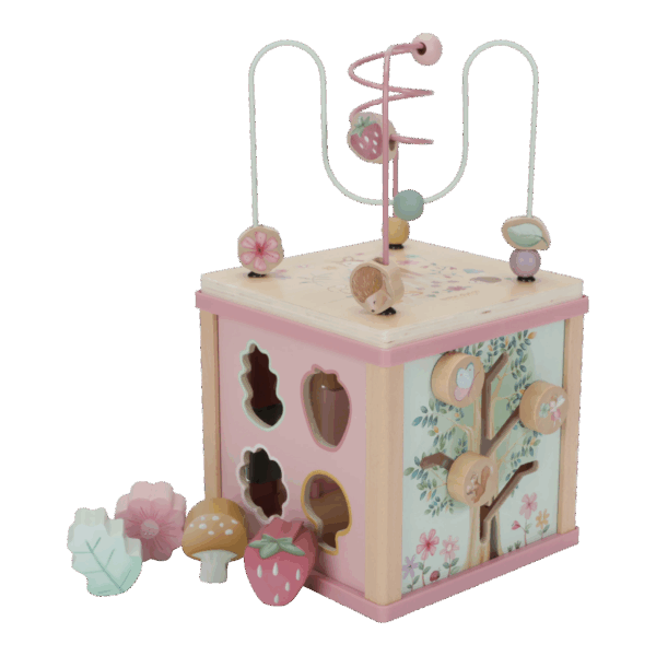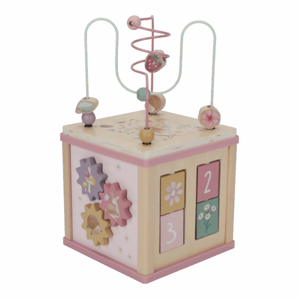 Kreni u avanturu istražujući svaki deo ove zabavne kocke sa aktivnostima! Svaka strana donosi prelepe elemente iz kolekcije Vrt vila i nudi zanimljive edukativne zadatke, uključujući sortiranje oblika, okretne zupčanike, slagalice i izazovni lavirint sa perlicama na vrhu. Kroz ove zabavne zadatke, tvoje dete će razvijati finu motoriku i biti podstaknuto da oslobodi svoju kreativnost.