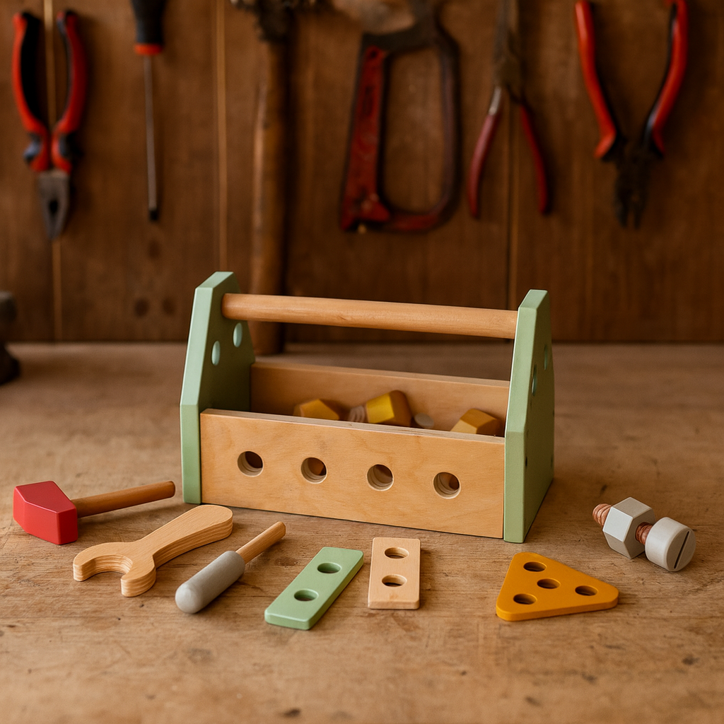 Ova drvena kutija sa alatima sadrži čekić, šrafciger i ključ, savršene za pravljenje najlepših kreacija.