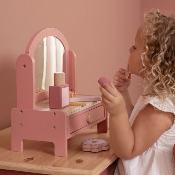 Ovaj drveni toaletni sto za decu podstiče maštovitu igru i dolazi sa rotirajućim ogledalom. Uključuje niz proizvoda za igru uloga, poput češlja, parfema, ruža za usne, senke za oči, turpije za nokte i laka za nokte. Takođe ima fioku za odlaganje gumica za kosu i ukosnica (koje nisu uključene). Sa svojim predivnim ružičastim dizajnom, savršeno je za svaku igraonicu.