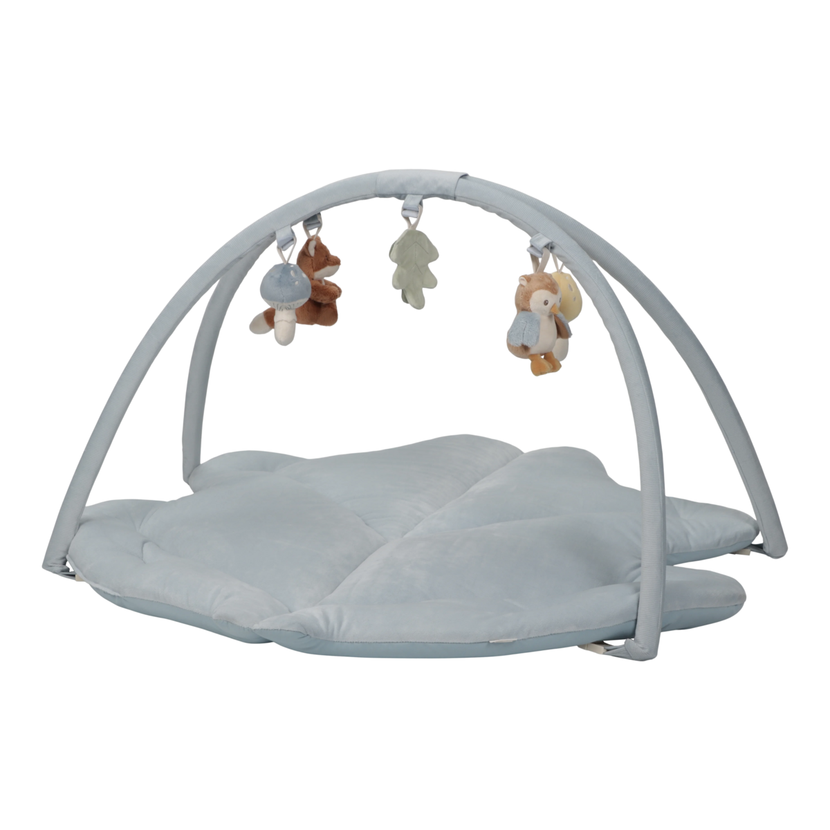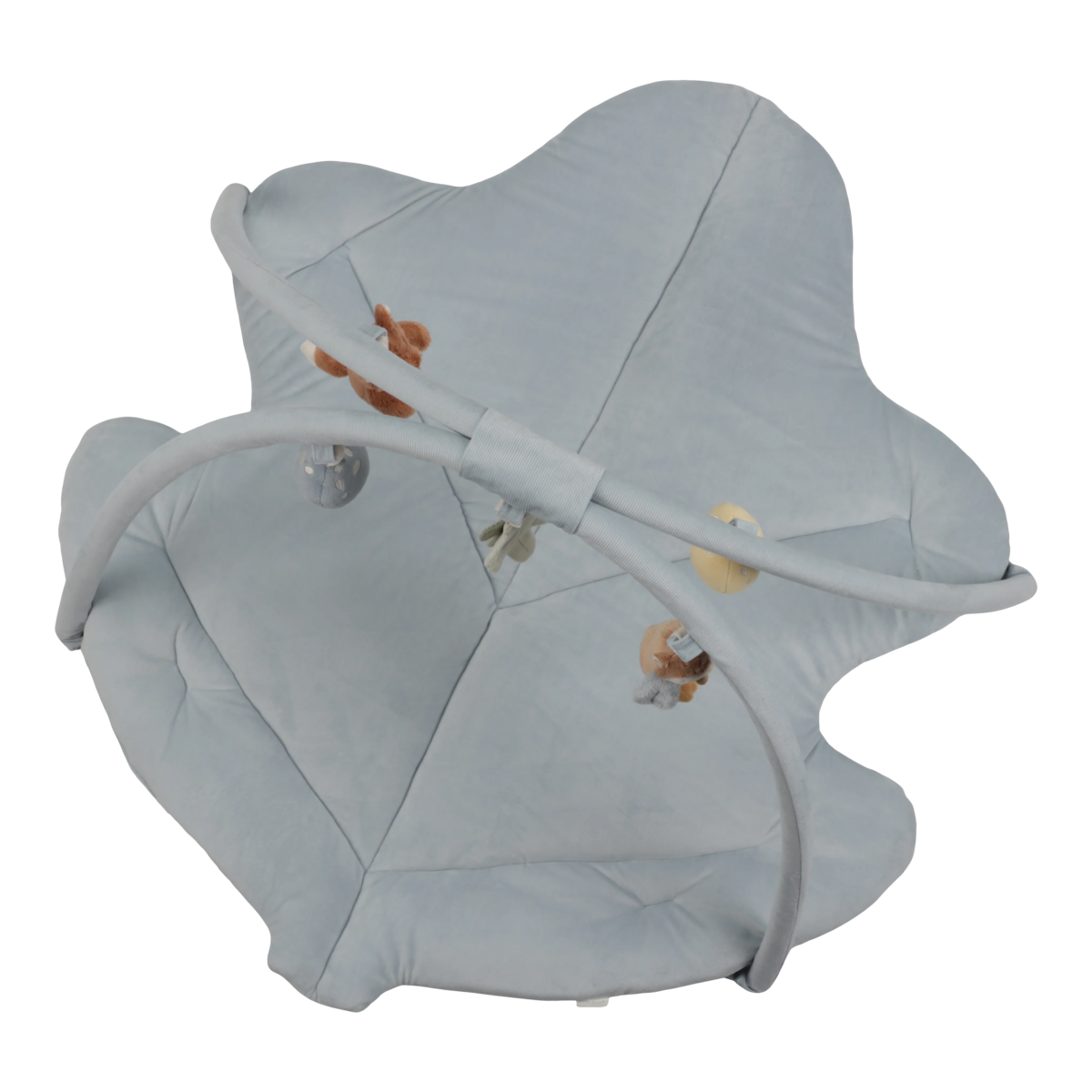 Ova prostirka u obliku lista, u nežnoj plavoj boji, pretvara svaki trenutak u uzbudljivu avanturu za vaše dete. Prostirku krase dve somotske prečke na kojima visi pet različitih mekanih igračaka iz kolekcije Forest Friends. Mali lisac, mudra sova, žuta i plava pečurka, kao i listić, dizajnirani su da podstiču razvoj senzornih veština i koordinaciju ruku i očiju