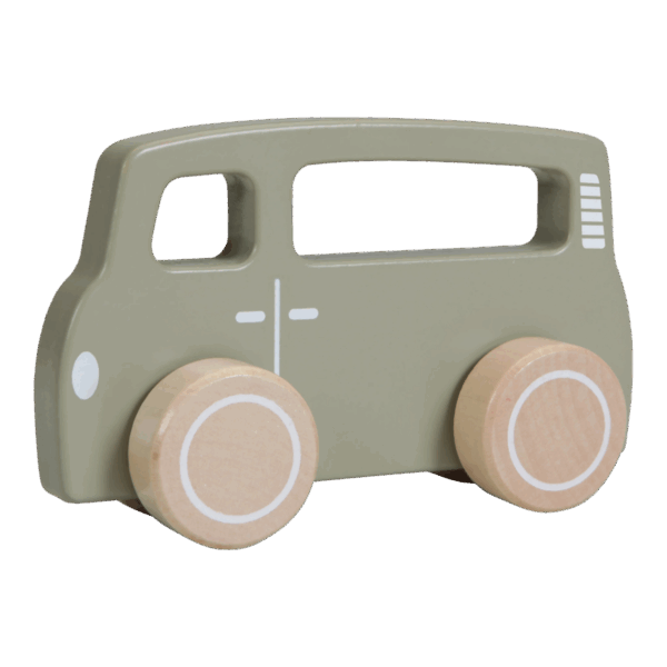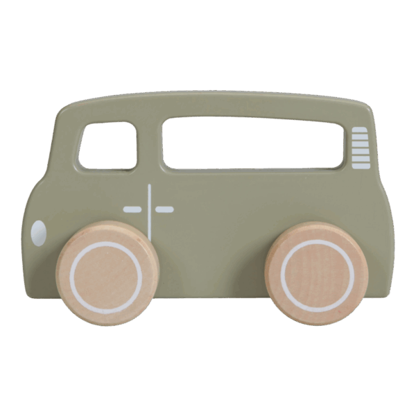 Ovaj simpatični Little Dutch kombi u prelepoj maslinastoj boji veseo se kotrlja uz pomoć čvrstih drvenih točkova.