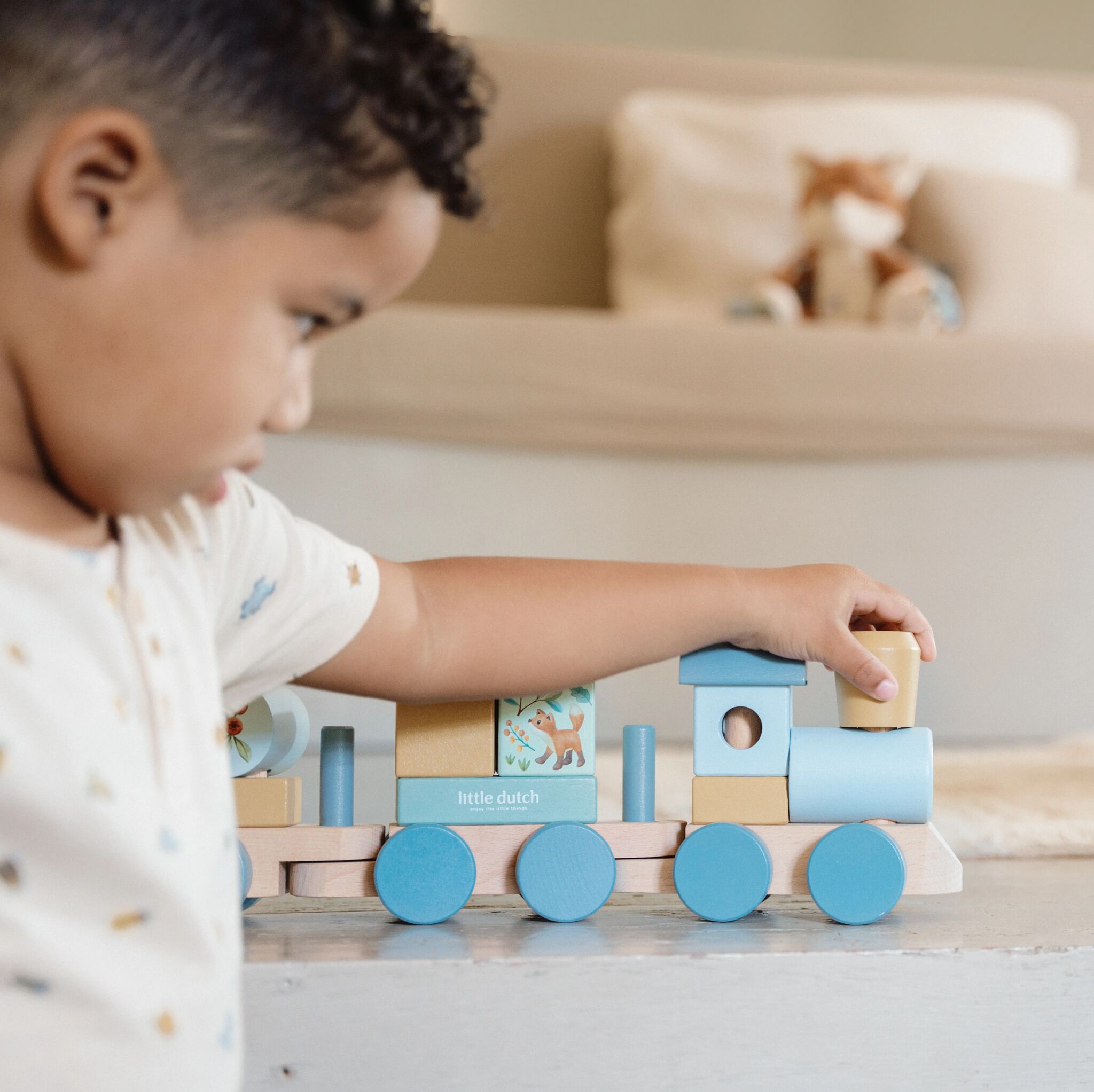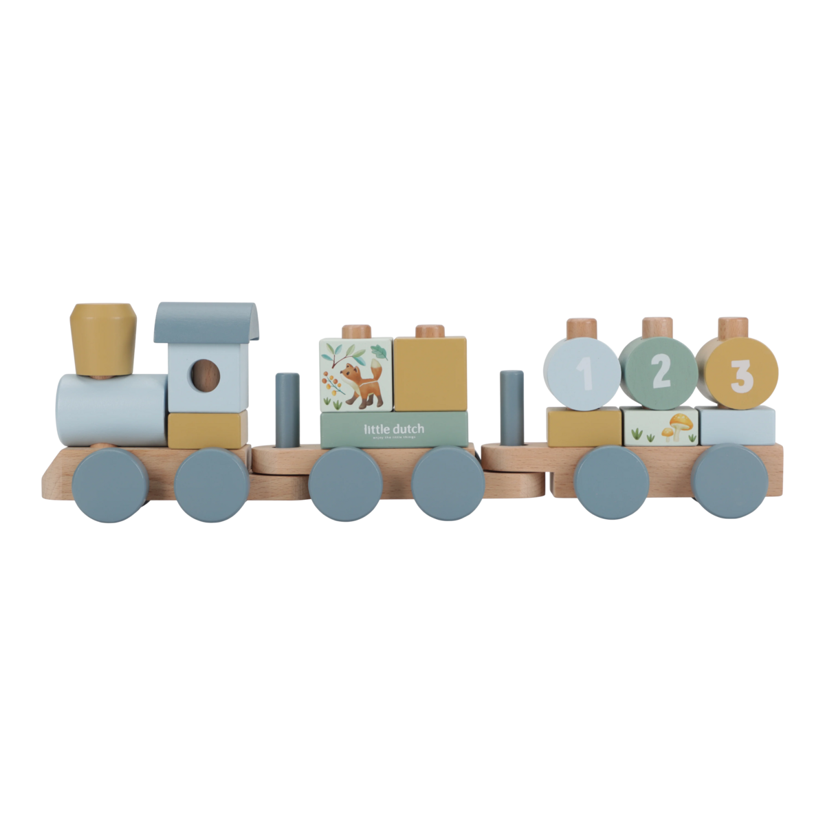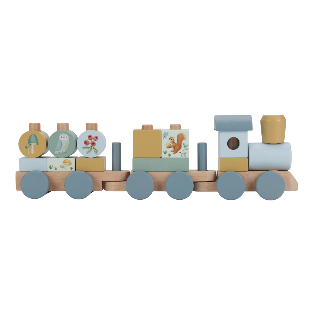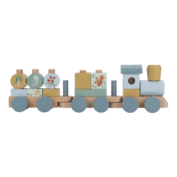 Sa prirodnim blagom, nekim od prijateljskih stanovnika šume i brojevima 1, 2 i 3 koji krase pojedine blokove, ovaj vozić za slaganje vodi te u svet mašte i čuda. Zabavan način za igru i istovremeno razvoj koordinacije ruku i očiju. Vozić sadrži 17 delova i dugačak je oko 45 cm.